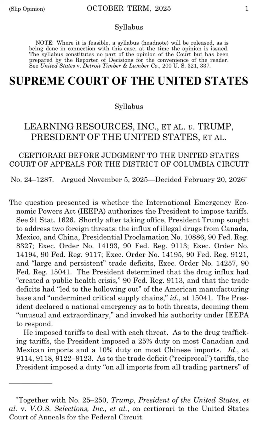 当地时间2月20日,美国最高法院公布裁决,认定美国《国际紧急经济权力法》没有授权总统征收大规模关税,这意味着特朗普上任后的核心关税政策违法。此后,特朗普政府紧急签署行政令对来自所有国家和地区的商品加征10%的关税。21日,特朗普又宣布将这一关税增加至15%。新关税会在美国时间2月24日生效,同时旧关税失效。