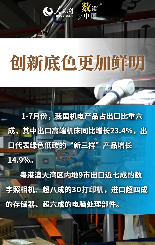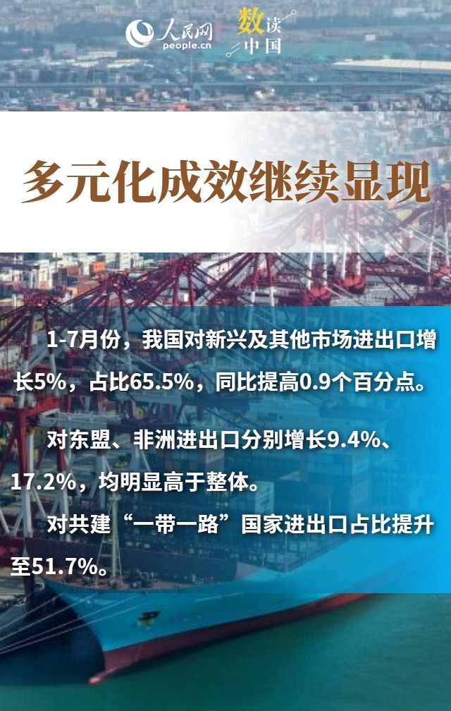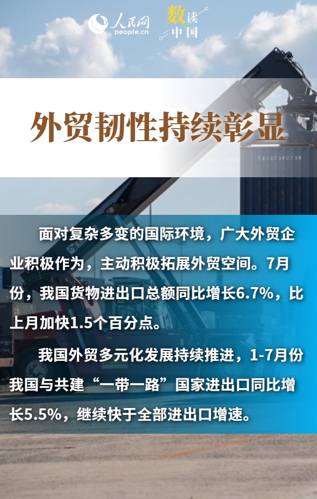 进出口规模创历史新高、“朋友圈”不断扩大、民营企业持续创新……数据显示,今年前7个月,我国货物贸易进出口总值25.7万亿元,同比增长3.5%。在外部挑战之下,我国货物进出口持续增长,展现出较强韧性和活力,为世界经济复苏注入了中国力量。